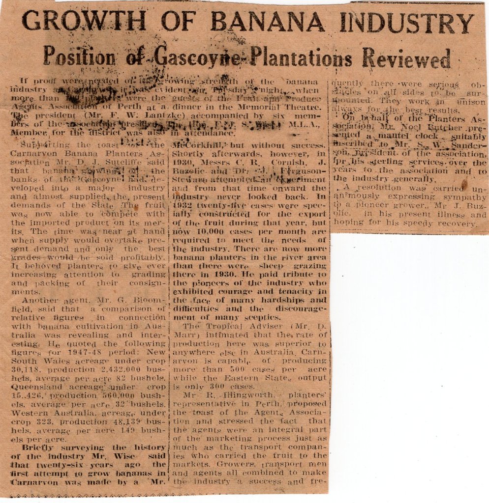 In the early 1920s there was growing interest in the opportunity to make greater use of the large reservoir of artesian water stored beneath the sandy Gascoyne River and to cultivate the alluvial soils stretching away from the river’s bank. The artesian water source had been found to be plentiful; coupled with the sub-tropical climate and the alluvial soils, the region provided ideal growing conditions for a wide range of vegetables and fruits. By the late 1920s Carnarvon landholders and businessmen were sprouting the merits of the fledgling horticultural industry. Politicians wanted to expand the economy, which until this time, was reliant on the pastoral industry.