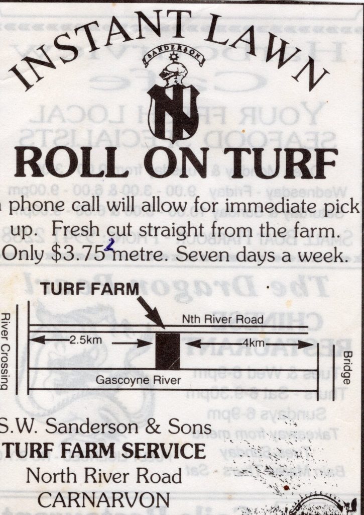 In 1998 they turned their efforts to turf farming in response to the residential and marina developments in Exmouth. Marketed as Sanderson Turf Farm, the venture resulted in one and a half acres of turf being cultivated. They grew the drought tolerant varieties of Greenly Parks and Short Leaf Buffalo. The turf can be found in Carnarvon at the Northwater public space, in Gascoyne Junction, Coral Bay and Exmouth.